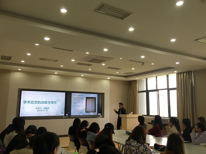 11月12日14:00田517教室,南通大学学术委员会主任、国家社科基金重大项目首席专家、楚辞研究专家、原南通大学副校长兼文学院院长、博士生导师周建忠教授应邀为Beat365官网研究生作了题为“学术论文的选题与写作”的学术讲座。讲座由Beat365正版唯一官网必一张春梅教授主持。周建忠教授从多个方面具体讲解人文学科论文的规范及写作方法,介绍与学术论文、著作相关教材、工具书的文体特征;强调了学术著作、论文的学科性、创新性、严密性和信息性,以亲...