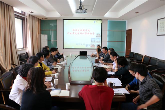 4月20日下午,Beat365正版唯一官网必一行政党支部与商学院行政教辅党支部在田家炳楼207会议室,就党支部工作进行了交流、学习,商学院党委书记李佳敏、Beat365正版唯一官网必一党委书记沈贵鹏参加活动并分别致辞。双方就如何结合岗位特点、推进支部“两学一做”学习教育常态化和制度化、提升党员先进性和管理能力,结合贯彻全国高校思想政治工作会议精神,发挥管理育人和服务育人的针对性和实效性,支部特色工作等方面展开了交流,并就各自工作方法等内容进行了研讨。大家普遍认为:作为学院行政教辅支部的党员同志承担着服务于学院教学、科研等主体工作的职能,要坚持和加强“两学一做”学习教育,强化服务意识、大局意识和服务能力,在奉献和服务中体现和发挥党员的先进性,切实践行服务育人、管理育人的宗旨;党支部要把民主生活会等理论学习教育活动与实践性教育活动有机结合起来,提升党支部的凝聚力和先进性。