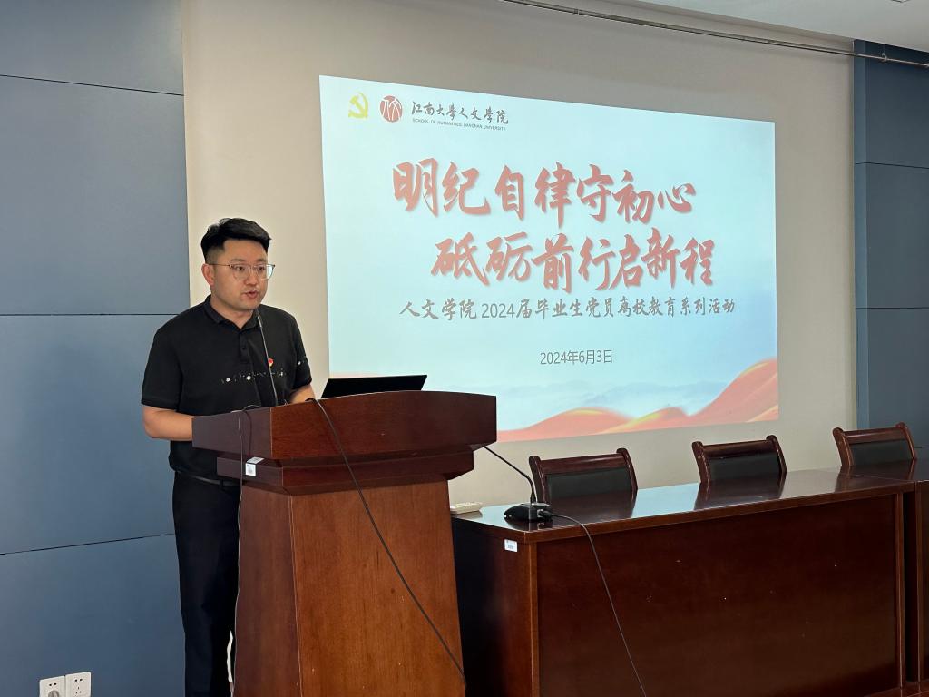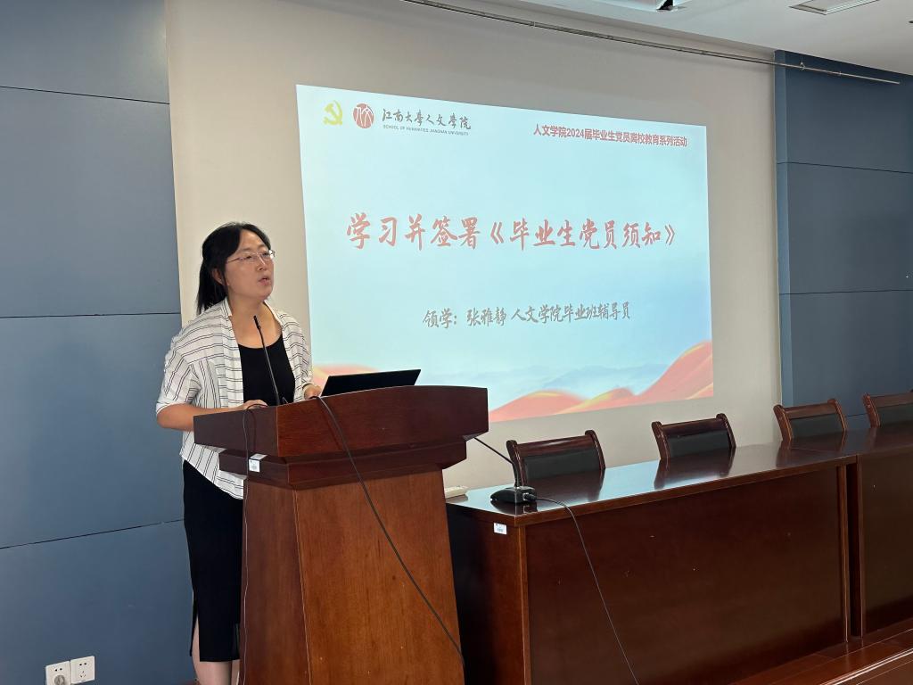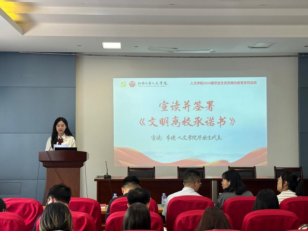 会上,张雅静全面解读了《毕业生党员须知》并作了毕业生党员组织关系转移工作专题培训。2024届汉语言文学专业本科生李婕作为毕业生代表宣读并签署《文明离校承诺书》。