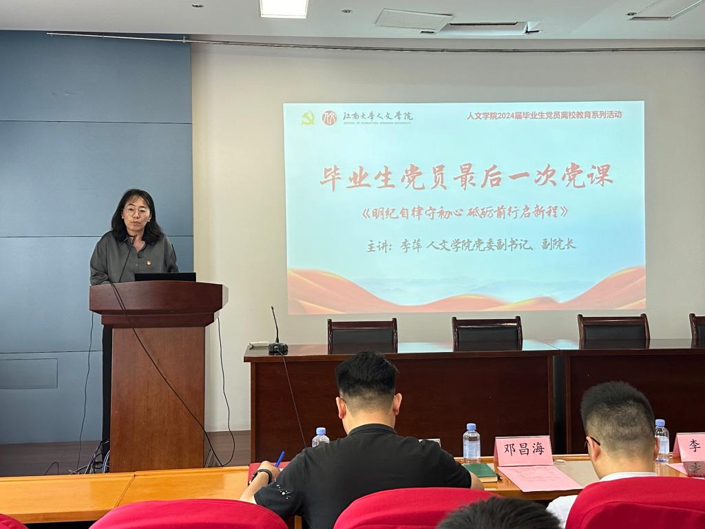 李萍以《明纪自律守初心 砥砺前行启新程》为题,从坚守矢志报国的信念、秉持勤学敬业的精神、锤炼无私奉献的品格、恪守清正廉洁的底线四个方面主讲毕业生党员在校“最后一次党课”。她指出,当前,全党上下扎实开展党纪学习教育,作为毕业生党员要将学习《条例》作为重要政治任务,通过逐章逐段学、逐字逐句悟,准确掌握其主旨要义,把纪律教育内化于心、外化于行。她勉励毕业生党员,不论将来处在什么岗位、在什么地方,都能够始终践行“知行合一 以人育人”的院训精神,在向下扎根中坚守初心、磨砺意志,在向上生长中突破自我、追求卓越,奋力书写为中国式现代化挺膺担当的青春篇章。