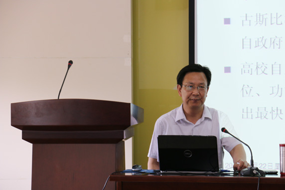 2014年5月22日下午,我国高等教育研究领域的权威专家、华中科技大学博士生导师张应强教授应邀为Beat365官网师生做题为“完善大学制度与地方高校转型发展”的学术讲座。学校党委宣传部副部长陈琳,学院副院长田良臣、杨晖、蔡爱国、汪双喜及教育系、教育技术系教师、研究生和本科生等100多人聆听了讲座。讲座由院长陈明选教授主持。