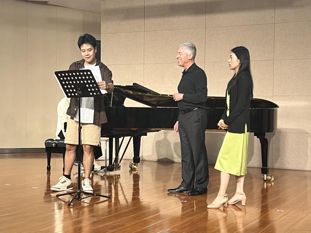 在教学互动环节,Robert Wells教授为音乐系四位学生进行了个性化歌曲指导。首位学生演唱了歌剧《唐璜》中的咏叹调《夫人请看这张名单》。Dr.Robert Wells强调,在演唱意大利歌曲时,元音的连贯性至关重要,建议学生在演唱前充分吸气,保持声带的持续打开状态,并确保声音位置的稳定性。紧接着第二位学生演绎了歌剧《艺术家的生涯》中的咏叹调《漫步街上》。Dr.Robert Wells指导学生在演唱时避免用力挤压声带,而是应放松身体,让气息自然吸满并保持流动。他推荐通过高抬腿边走边唱的方式来帮助身体放松,同时在走动中利用背部肌肉为歌唱提供支持。第三位学生呈现了歌剧《塞尔维亚理发师》罗西娜的咏叹调《美妙的歌声随风飘荡》。Dr.Robert Wells建议通过转动胯部等身体活动来训练演唱时的核心稳定性,同时保持声带的放松和元音的连贯,确保气息带动声音持续向前,以维持音乐的流畅性。最后一位学生演绎了歌剧《费朵拉》洛里斯的咏叹调《被阻止的爱》。Dr.Robert Wells首先对学生的声音和歌唱能力给予了肯定,并建议在演绎时避免过度用力,推荐使用气泡音和打嘟噜等技巧来辅助演唱,以轻松减少喉部的压力并放松声带。在讲座问答环节,参会学生就声带保养、气息训练及快板的演唱技巧等具体问题与Robert Wells教授进行了热烈交流,师生们纷纷表示受益匪浅。