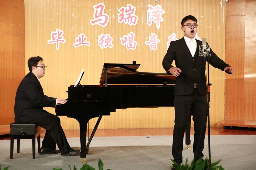 马瑞泽用其低沉浑厚的男中音音色,为我们演绎了《嘎达梅林》 《破碎的心》 《满江红》等四组中外艺术歌曲,融合了重唱、对唱等艺术形式,为莅临现场的副院长符姗姗教授、音乐系主任马克老师、王芳教授等领导、老师和同学们带来了一场充满学术性、艺术性、趣味性的“听觉盛宴”。