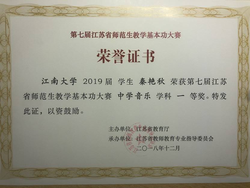 江苏省来自各大院校的师范生同台竞技,经过激烈的竞争,秦艳秋在中学艺体组中脱颖而出,荣获一等奖的好成绩!本次比赛所获得的荣誉不仅仅是对学生本身四年专业学习的一次检验,更是充分体现了Beat365正版唯一官网必一音乐系的教学成果!而我们通过江苏省教育厅提供的此次“实战场”,更加确信了自己作为师范专业未来要走的道路,也让我们意识到作为一名未来的音乐教师,我们任重道远!