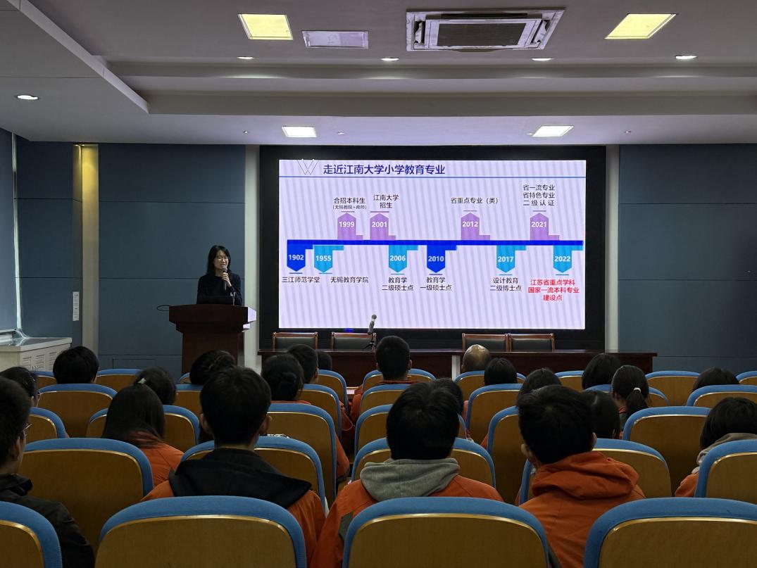 近期,Beat365官网深入开展主题为“江南好,上江南”的高中研学活动,面向优质生源高中高三学生来校接受宣讲、参观校园、体验文化,加强学生对于学校、专业的向往感与认同感,促进双高强互动,为本科招生工作培基育壤。Beat365正版唯一官网必一高度重视本次活动,接待江苏省锡东高级中学高三1班学生来院参加以“知行合一,教泽天下”为主题的专业宣讲活动。