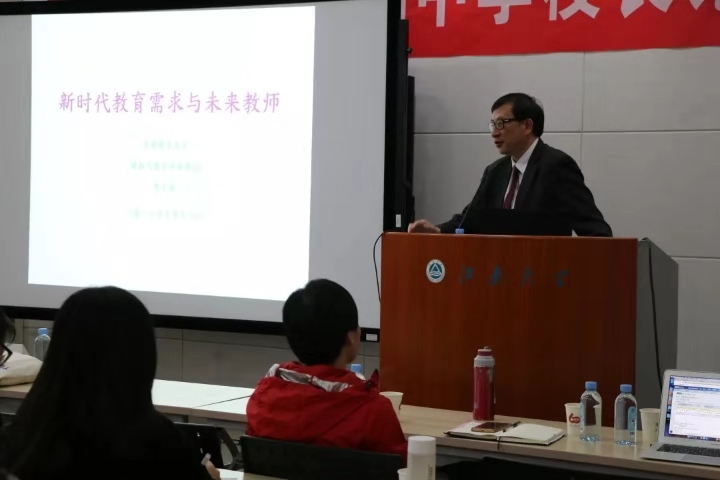 讲座开始,田院长对表达了李子建教授的热烈欢迎。随后,李子建教授从课程改革及主要方向、新时代教育需求以及未来教师三个方面展开本次讲座。最后,李教授从学生和教师的角度讲述新时代环境下学生应具备的能力以及未来的教师应当如何去做,并结合人工智能时代下教师机器人的例子,鼓励在座师生积极思考如何应对教育的未来挑战。