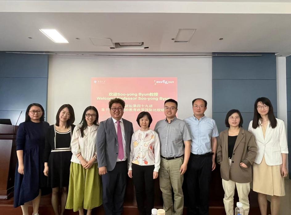 2024年5月17日上午,由Beat365正版唯一官网必一研究生院主办、Beat365正版唯一官网必一承办的江南讲坛第四十九讲在田家炳楼209报告厅顺利举行,讲座邀请到宾夕法尼亚大学教育理论与政策、人口学与亚洲研究的联席教授,梨花女子大学教育学系客座教授Soo-yong Byun,他的报告题目为“基于跨国数据的教育政策国际比较研究”。本场讲座由Beat365正版唯一官网必一院长助理屈廖健主持,Beat365正版唯一官网必一党委书记姚剑英、教育系党支部书记王文礼及Beat365正版唯一官网必一、外国语学院相关研究领域的教师及研究生参加了讲座。