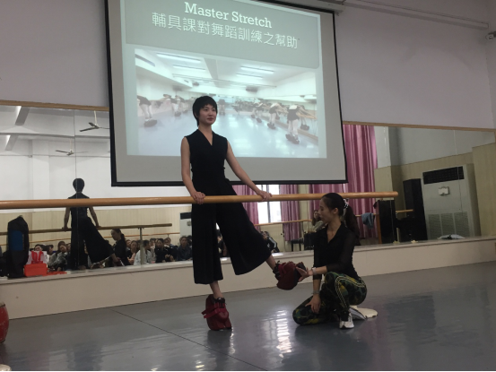 本次讲座主要分为基础知识讲授和实践体验两个部分。在基础知识讲授部分,何郁玟老师循序渐进地讲解了舞蹈辅具训练对增强舞者身体肌肉力量的重要性,使学生认识到了辅具训练在舞蹈训练中的意义,同时也向我们讲解了她所带来的“Master Stretch辅具”的奇妙功能。