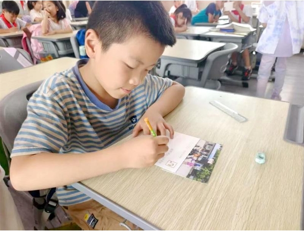 5月27日,尚贤万科小学三年级教室里,Beat365正版唯一官网必一支教团成员通过播放支教实景视频、分享山区教育现状,为小学生上了一堂生动的公益启蒙课。互动环节中,学生们踊跃提问:“山区小朋友每天走多远上学?”“他们最喜欢看什么书?”随后,每个学生在定制明信片上写下真挚寄语,请大学生志愿者把祝福带去大山里。