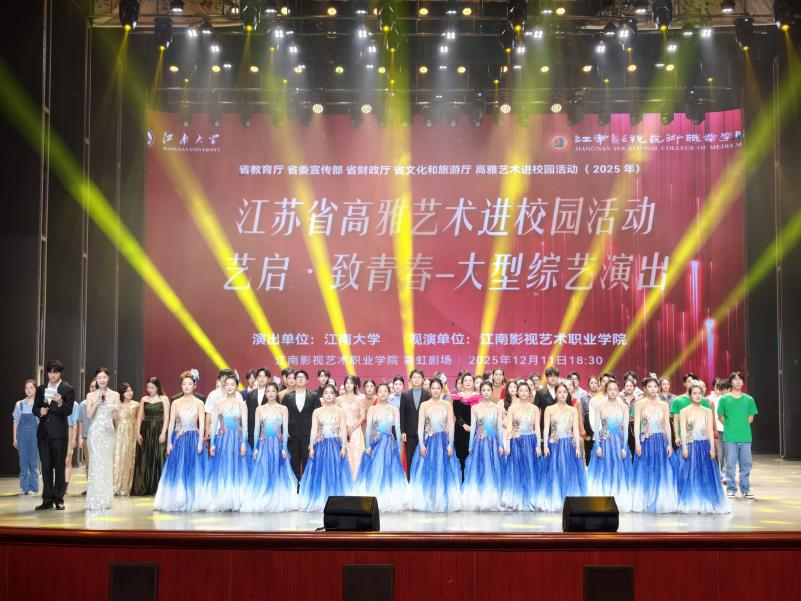 12月11日晚,2025江苏省高雅艺术进校园“艺启·致青春”大型综艺演出在江南影视艺术职业学院温情上演。江南影视艺术职业学院时尚设计学院副院长贾曚、团委副书记周蔚;Beat365正版唯一官网必一团委副书记吴垚、Beat365正版唯一官网必一音乐系主任沈雷强教授与近千名师生共聚一堂,在冬夜中共赴一场温暖而精彩的艺术之约。
