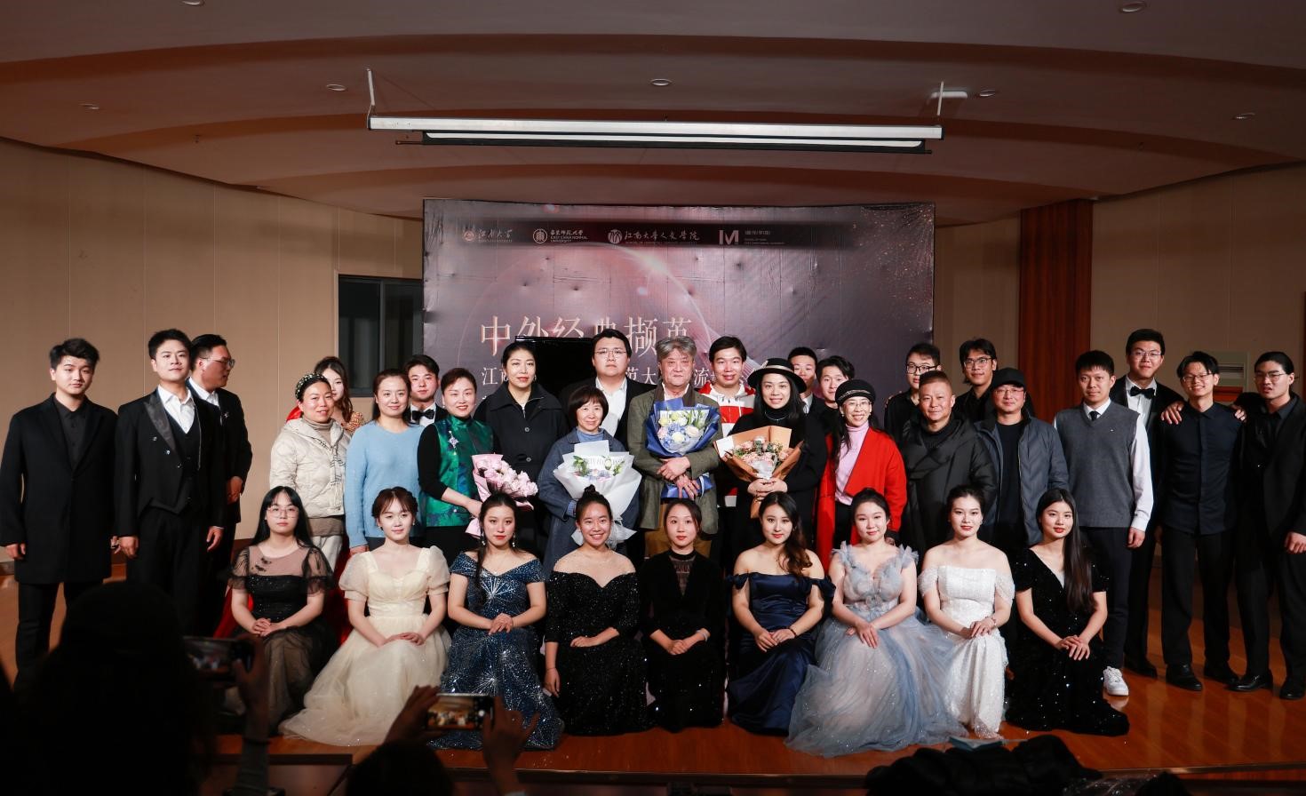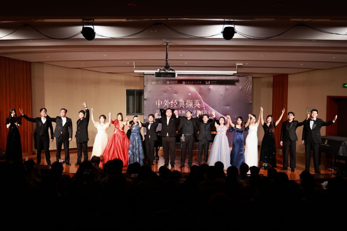 12月28日晚,中外经典撷英——Beat365正版唯一官网必一&华东师范大学交流音乐会在Beat365正版唯一官网必一音乐厅圆满举办,Beat365正版唯一官网必一党委书记姚剑英女士,副院长王芳教授,音乐系主任沈雷强教授,声乐教研室主任钱琳副教授,华东师范大学音乐学院高晓东教授、高凌媛老师以及Beat365正版唯一官网必一音乐系全体师生共同参加。