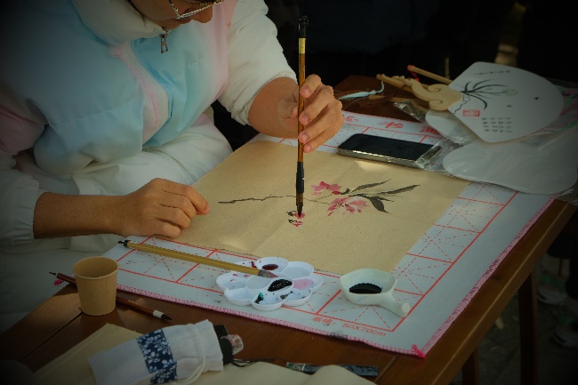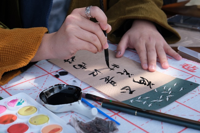 “瓦舍小集”部分包含五个互动环节。“雁字回时”书写信笺环节,参与师生将古诗词或心愿写在书签上,挂在樱花林,纸短情长,留下自己对春天的美好期盼。“茅塞顿开”环节包含猜灯谜、对诗词以及看图猜诗,蹙眉沉思之间体验古人吟诗猜谜的乐趣。“白羽飞矢”投壶环节再现“射者中,奕者胜”的喜悦与欢畅。“拨云见日”猜识甲骨文环节,古朴空灵、亦简亦繁的象形文字激发着人们以想象力与古人共情文字的魅力。“晕染江南”画团扇环节,参与师生绘山描水,织木画鸟,参与者亲自动手为自己定制一面团扇,与樱花相映,美美与共。参与以上活动,按照规则集齐相应印章者即获赠限定樱花明信片一套或樱花金属书签一组。同时,活动现场设置茶艺展示及古筝演奏,茗香沁人,筝声入耳,为现场师生及校友带来全方位的传统文化体验,精彩丰富的活动引来游人如织,络绎不绝。
