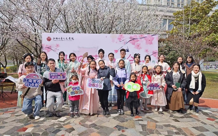 在“逸兴云飞”部分,来自汉风社的汉服走秀向观众展示了一幅春风拂袂,罗衣飘飘的国风少女图,让“巧笑倩兮,美目盼兮”的绝色佳人在千年后重现。接着,周永琪、孙歌阳两位同学先后讲解了诗词《春望》和《忆江南》,在樱花丛中将诗圣杜甫“国破山河在,城春草木深”的春之泣泪,诗王白居易“日出江花红胜火,春来江水绿如蓝”的春之礼赞一字一顿娓娓道来。之后,在民乐合奏《青花瓷》环节,二胡、古筝等乐器声律合鸣,歌颂大好春光,吟哦林间诗兴。高古动人的乐音在整片樱花林上空缭绕不绝。而后,刘宇、杨旭与毛鸿如、肖天宇两组同学分别带来《春到江南》和《赞美》诗朗诵,用富于感染力的嗓音抒发心中的春日诗意。来自小先生未来教师协会的李彤同学现场书写“春”、“花”、“江南”,软笔书法展示的同时为最后一个环节飞花令题字出题,边界文学社与国学社各推举两位代表进行比拼,激烈的对答吸引了现场观众小朋友一同参与其中,进行作答。