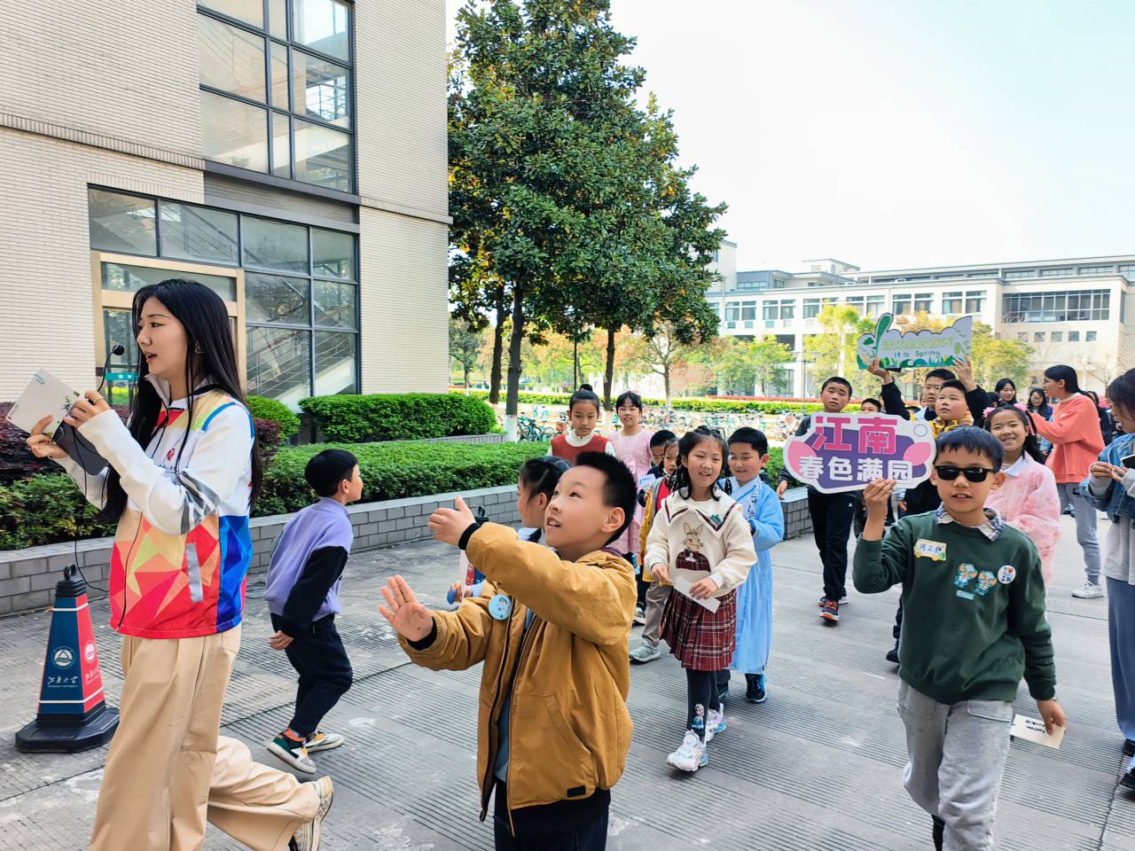 “江南游春,寻芳觅古”环节,中文本科生第一党支部的党员志愿者们带领孩子们走向户外,在美丽的江大校园里用脚步追随春天的步伐,探索“一桥一亭一雕塑”中的文化。此次游学的路线,志愿者带领小朋友们在一教孔子像前聆听了至圣先师的谆谆教诲,并一起学习了拱手礼;七曲桥上,小朋友们听完志愿者的解读,争先恐后背出与“春”和“桥”有关的诗句;小蠡湖边,志愿者向小朋友们普及了“蠡”字是由范蠡泛舟的故事得来的;走过曲水桥,史记亭中小朋友们聆听了《史记》的创作背景以及对后世的影响。最后一站,钱穆像前,随着志愿者介绍完钱氏家族的优良家风和众多传奇人物,此次游学活动圆满结束。