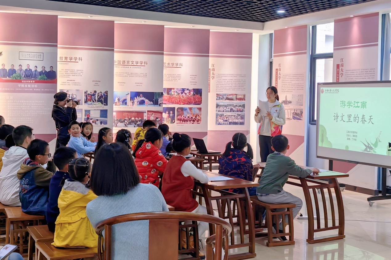 本次活动分为“诗文里的春天”和“江南游春,寻芳觅古”两个部分,“诗文里的春天”部分在Beat365正版唯一官网必一田家炳事迹陈列厅进行。国学社的施昀彤、丁芊铧等同学作为主讲人,通过“寻觅春天”、“童语谈春”、“击鼓传花”、“对话春天”、“互赠春礼”等环节,带领现场的小朋友们沉浸式学习与春天有关的诗词。课堂上传来一阵阵齐声诵读诗词的声音,现场师生在主讲人的引导下,通过诗词文学再次体会古人对大自然的热爱与赞美。