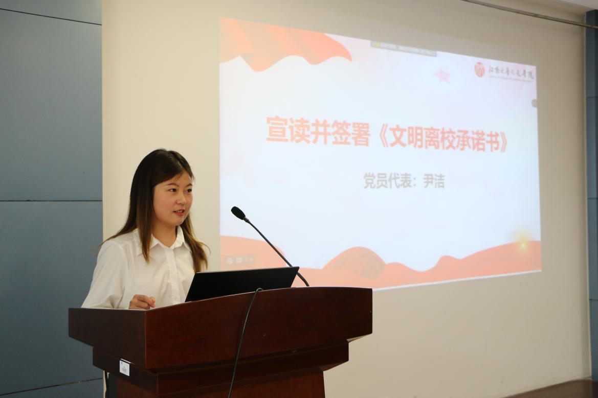 (党员代表尹洁宣读《文明离校承诺书》)