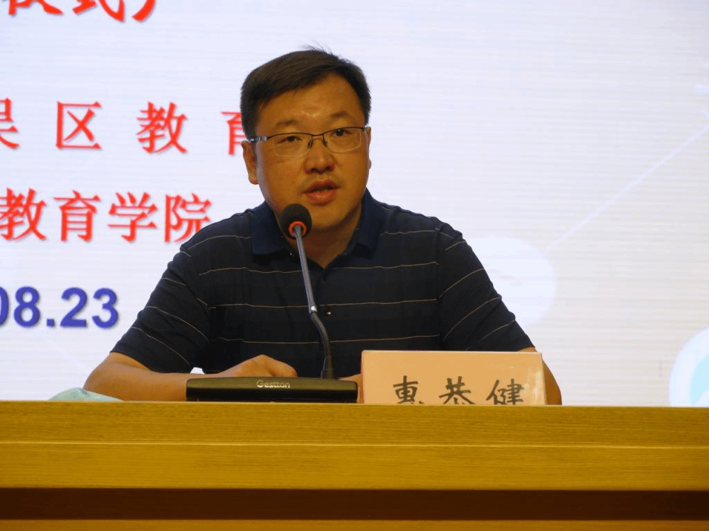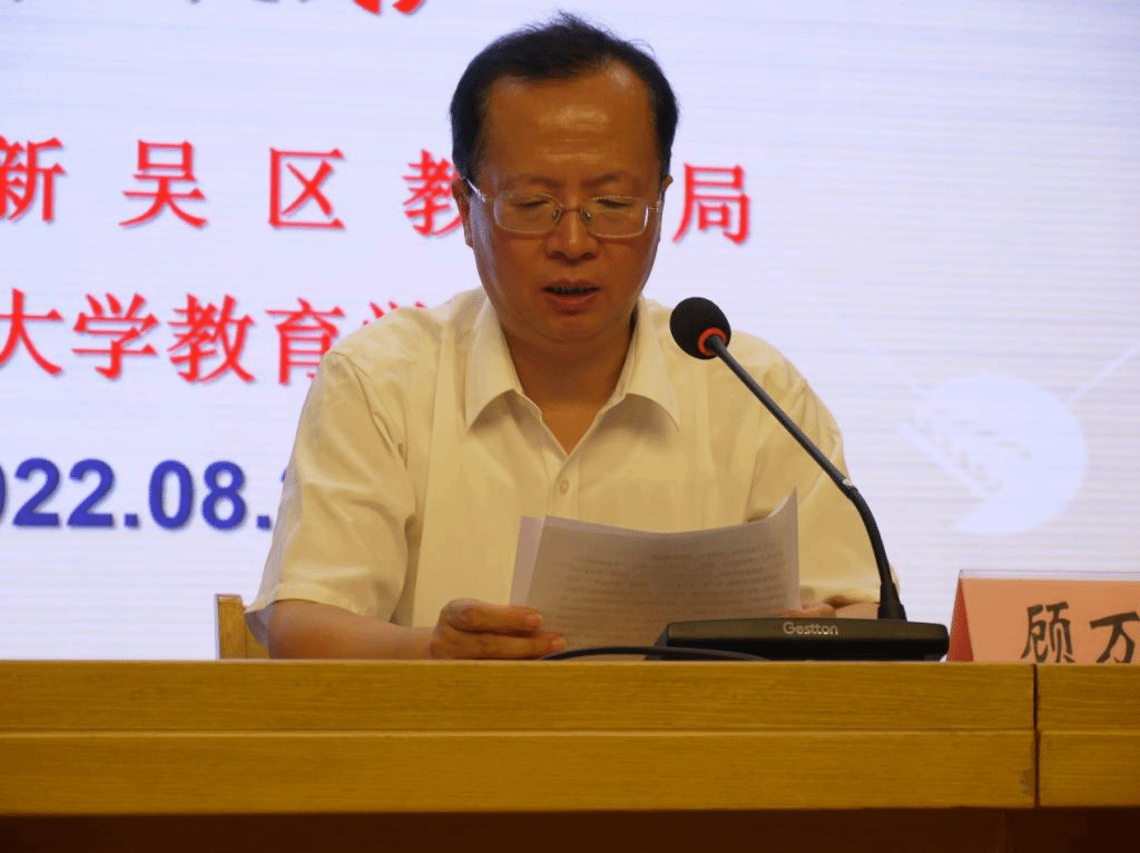 随后,顾万春主任代表新吴区教育局讲话。他首先欢迎新教师们过关斩将,加入新吴教育大家庭。他提出希望各位学员能够牢记为党育人、为国育才的初心使命,践行学高为师、身正为范的德操和风范,树立学生为本、终身学习的理论和追求,为新吴教育高质量发展贡献力量。