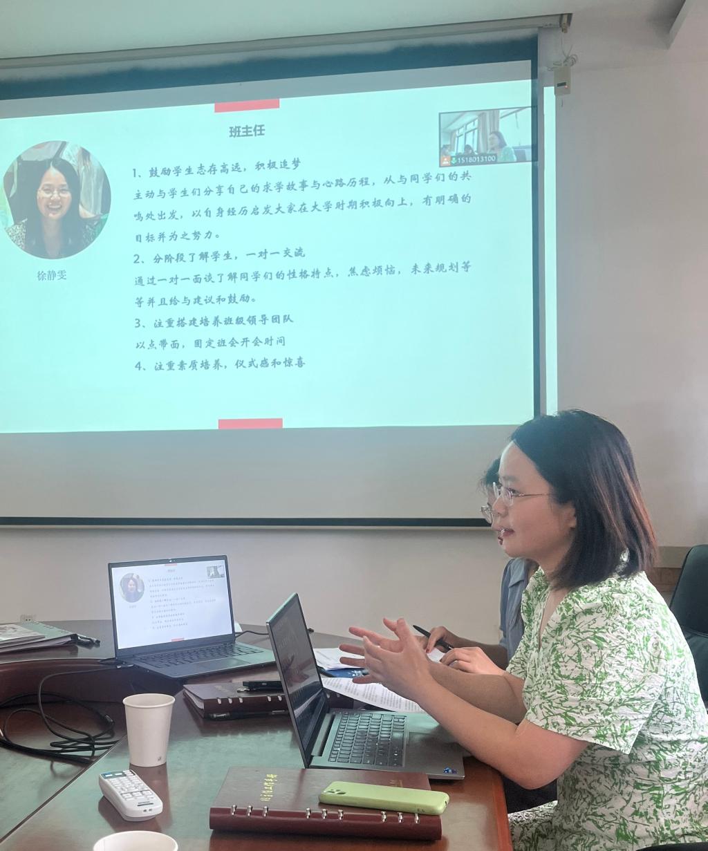 接着,徐静雯就如何做好班主任作了心得分享:班主任要鼓励学生志存高远,积极追梦,要分阶段来了解学生,通过一对一面谈了解同学们的性格特点和未来规划,并且给予针对性的建议。班主任要注重学生的素质培养,尤其是学生干部的素质,要充分发挥学生骨干的先锋模范作用,从而实现以点带面。此外,班主任要注重“仪式感”,时不时的小惊喜可以让学生感受到温暖与鼓励。
