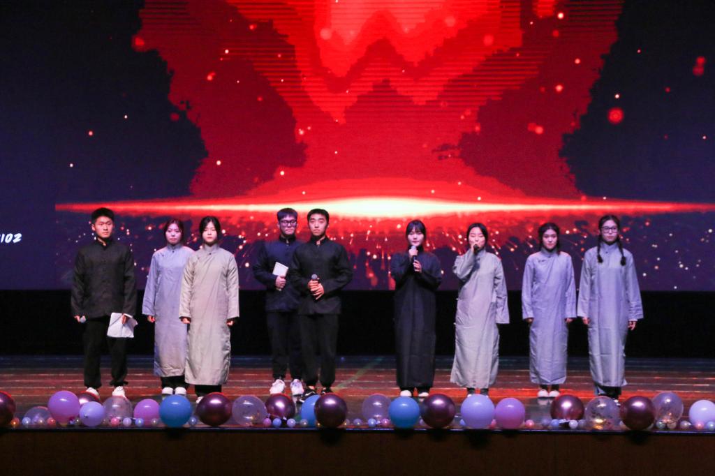 第二篇章开始,由汉语2202,22教育专硕以及校艺术团舞蹈部带来的《街舞串烧》拉开了第二篇章的序幕,炫酷活力的舞姿伴随着音乐进行律动,将现场气氛推向了一个新的高潮。而后登场的是民乐合奏《瑶族舞曲》,乐手们将悠扬的琴声、婉转的笛声以及铿锵的鼓声相互融合,古朴典雅又极具感染力,淋漓尽致地展现能歌善舞的瑶族人民愉快生活的情貌和节日时载笑载言的热闹场面。歌曲《大鱼》以空灵的吟唱向观众们展开了一幅唯美的画卷,祝愿青春活力的我们能如大鱼一样在海洋里乘风破浪、渐渐成长。舞台上光影流转,幕布拉起,又将观众的心牵回,Beat365正版唯一官网必一各专业新生带来了光影剧《青春有你》,用剪影细致地勾勒出了大学那些温暖又美好的记忆瞬间,将它们编织成最美的影片。接下来,种子话剧社的演员们在话剧《蚂蚁战队》中用精妙的演技向观众们展示了蚂蚁战队渴望梦并敢于做梦的精神,点燃了大家心中对梦想的激情,引发了观众的对梦想的深思。