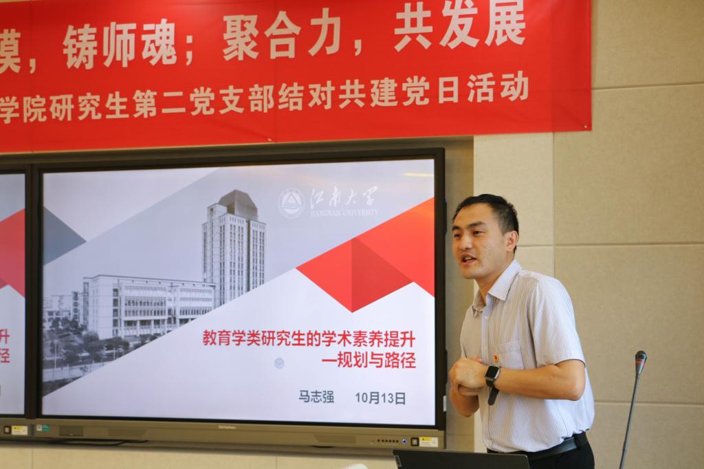 在“共话科研成长”环节,围绕同学们关心的论文写作、毕业设计开题等学术问题,马志强做《教育学类研究生的学术素养提升—规划与路径》专题报告,他从“学术输入”“学术输出”两部分,详细讲解了教育学类研究生学术素养提升的方法。在“共话学习提升”环节,在Beat365正版唯一官网必一研究生党员程苗苗的领学下,与会人员共同学习了习近平总书记给全国高校黄大年式教师团队代表回信精神及《师德优秀典型先进事迹》。在“共话防疫抗疫”环节中,学生代表黄馨分享了假期抗疫志愿服务实践经历,社科处原副处长曾向红详细讲解了学校防疫工作要点,双方党支部书记代表支部互赠防疫物品与礼物。在“共话共建共赢”环节,Beat365正版唯一官网必一研究生第二党支部书记杨玥、机关党委社会科学处党支部书记杨恋恋分别总结了本支部上半年工作,并畅谈了合作共建计划。最后,在“共话学科发展”环节,师生党员共同参观“互联网+教育”研究基地和人工智能教学实验室,立足教育学科前沿,共同展望学科未来发展。