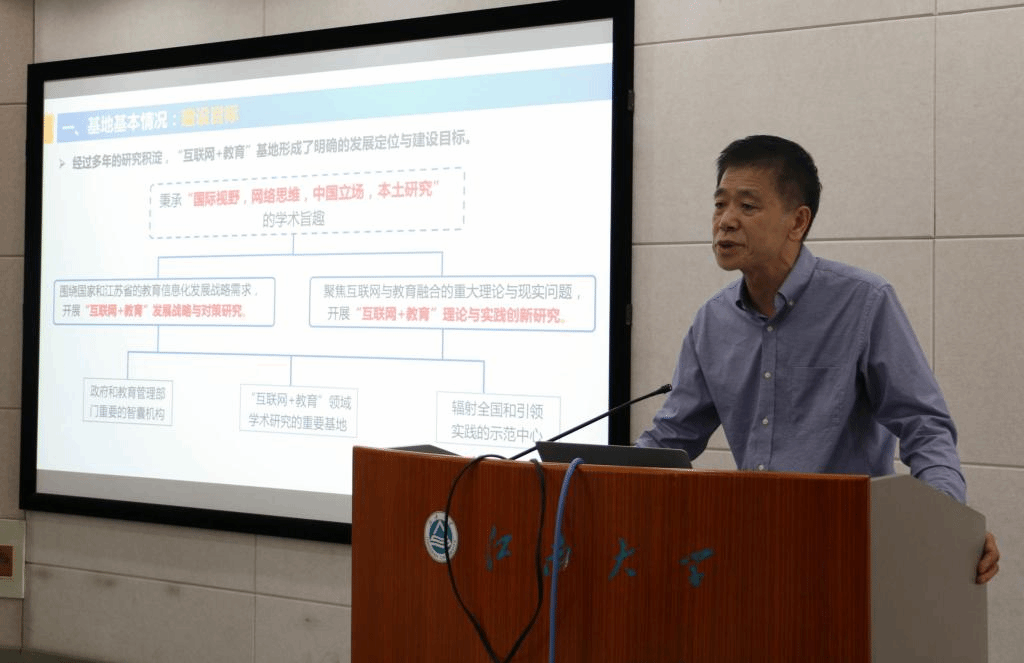 在近五年来取得的科研成果部分,陈明选教授指出,近5年基地专职人员承担各级各类项目总计72项,总经费621余万元。团队成员发表SSCI、SCI、CSSCI等论文125篇,出版专著12部,咨询报告3件,获“江苏省哲学社会科学优秀成果奖”等省市厅级奖励8项。在“互联网+教育”理论与战略研究方向上,开展了数字化教育资源的建设与服务研究,教育信息化战略与决策咨询研究,为国家和江苏省教育信息化发展提供了智力支持。在“互联网+”环境下的课程与教学研究方向上,长期致力于职业教育信息化研究和实践工作,深度参与清华大学牵头的多项职业教育重大项目;构建了促进深度理解的教学理论与实践体系,形成了研究特色,研究成果在全国居于领先水平。在网络环境下学习分析与评价研究上,与科大讯飞、极客大数据公司合作,开展了测评大数据支持下的学习分析与评价研究,在国内产生很大影响力。另外,在研究交流与宣传工作方面,基地每年举办国内高端学术会议,定期举办“互联网+教育”高端论坛、“互联网+教育”大讲堂等学术品牌活动,鼓励师生参与学术会议,并及时在基地网站和公众号上发布学术信息、介绍学术活动,营造科研氛围,提升学术影响力。在社会服务与成果转化方面,基地目前与国内外一流高校,增强学术研究与发展的生命力;与不同区域和地方教育部门、学校建立协同育人机制,发挥学术研究的教育价值;与教育信息化企业建立合作伙伴关系,助力科研成果向教育应用场景的转化,发挥学术研究的产业价值。
