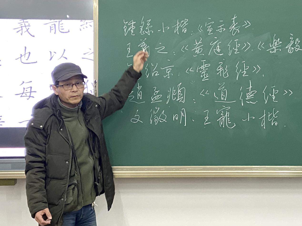 胡奕以往届学生的书法作业为对象,分别从整体效果、字形架构、笔画细节等方面进行了详细的分析,让“小先生”们了解到书法评价的知识与技巧。他还分享了自己的作品,讲述了练习书法的心得感受,使“小先生”们在提升书法审美的同时学到了书法练习的正确方法。针对临帖的问题提出了建议,他向大家推荐了赵孟頫的《道德经》、钟绍京的《灵飞经》、王羲之的《黄庭经》等作品作为硬笔临摹的字贴。