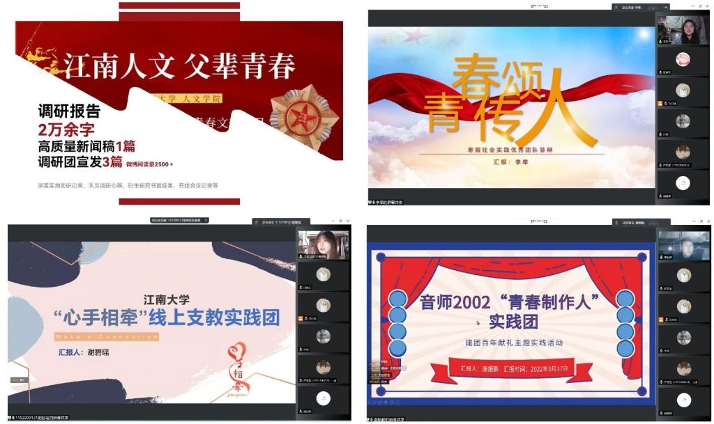 经筛选,此次答辩会共有11支团队、7个团支部和12位同学进入到最终的答辩环节。他们从实践选题、实践过程、实践效果、实践意义等方面介绍了各自团队的实践项目与完成情况。其中,“青春传颂人”团队分享了他们组织动员20余名团员青年参与共读《习近平与大学生朋友们》,同写读后感的实践过程,该项实践成果已陆续在学院公众号上发布。“缓病之计”社会实践团是舞蹈编导2020级同学立足于当代老年人病痛,让舞蹈走进社区伴健康晚年生活做的一次全新的尝试。“心手相牵”实践团这次则通过网络的方式开展了为期7天的“云支教”,为孩子们带去了寒假的问候,同时辅导完成寒假作业,帮助他们完成课业。
