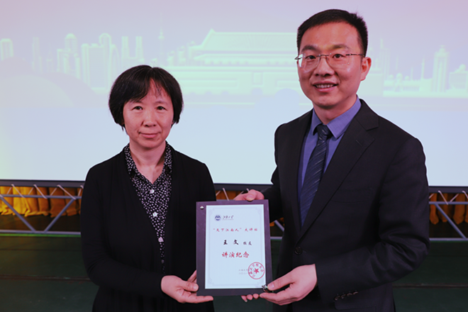 姚剑英书记为王文校友颁发“天下江南人大讲坛”演讲纪念牌