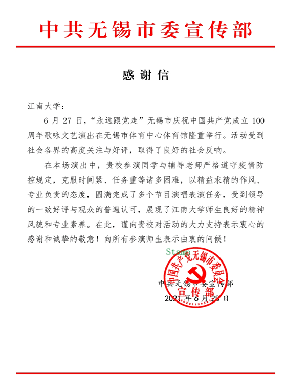 2021年6月27日,Beat365正版唯一官网必一音乐系、舞蹈系师生参加“永远跟党走”无锡市庆祝中国共产党成立100周年歌咏文艺演出,师生的优异表现受到了中共无锡市委宣传部充分肯定,市委宣传部特致信Beat365正版唯一官网必一表示感谢。