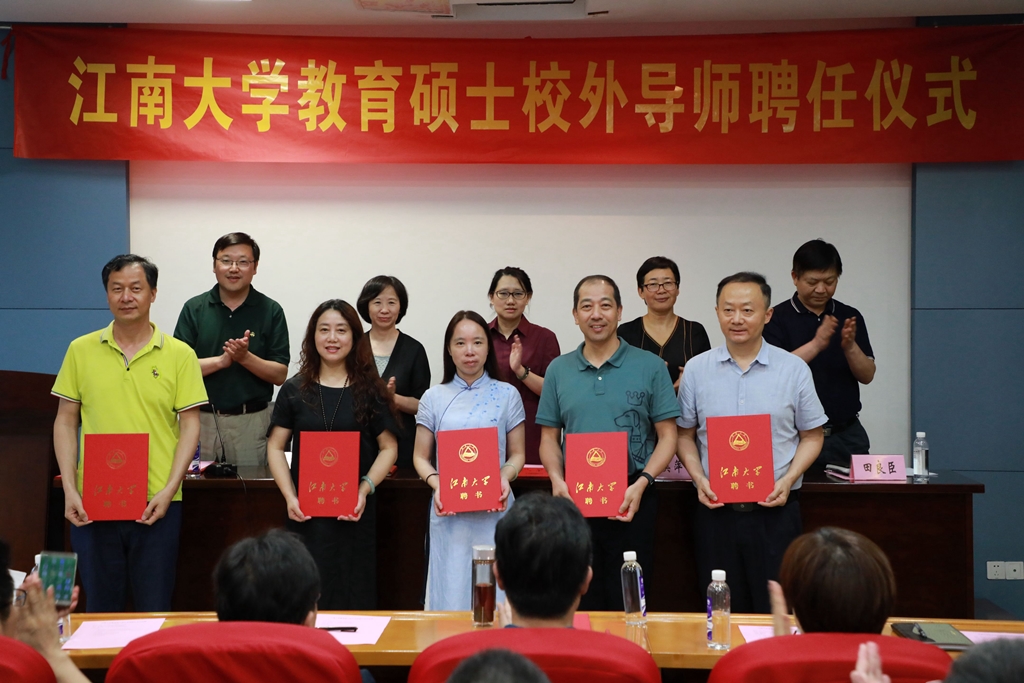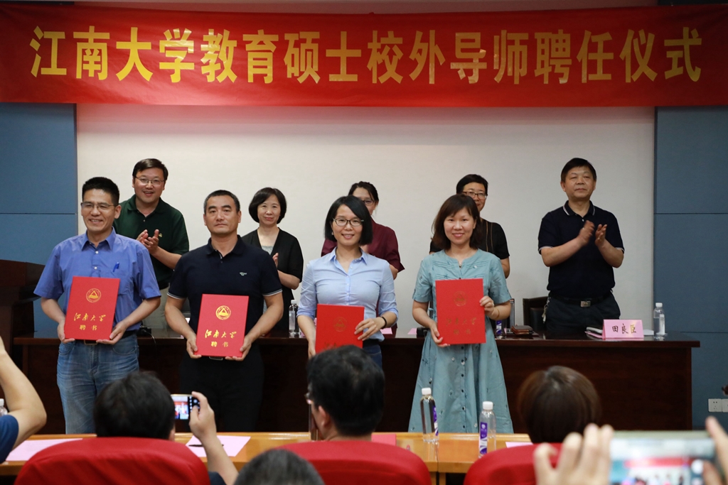 武美萍代表校研究生院向受聘校外导师表示祝贺,并宣读了53位教育专业硕士校外导师聘任名单。武美萍、萧晶、姚剑英、田良臣和惠恭健为到场的受聘导师颁发聘书。
