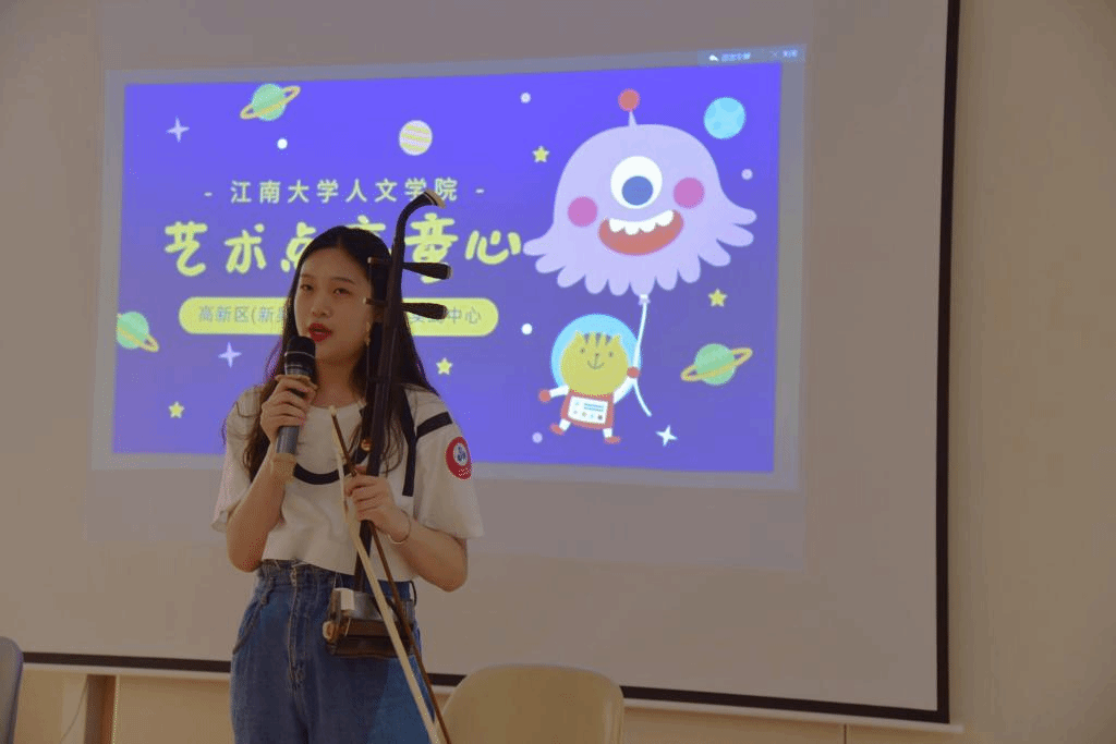 与首场演出不同的是,本场演出更侧重与观众的互动,整场活动共计10个节目,志愿者们将艺术教学融入到了表演与游戏中,可谓寓教于乐。在二胡合奏《洪湖人民的心愿》和小提琴独奏《唱支山歌给党听》结束后,志愿者通过讲解曲子的创作背景和故事,带领小朋友们学习党史,通过讲解乐器乐理知识向小朋友们做了艺术的基础普及。志愿者夏瑞在演唱完《不忘初心》后,声情并茂的讲解并现场教学如何歌唱发音、如何把握气流,幽默风趣的教学点燃了小朋友们的参与热情,也受到了家长们的肯定,取得了非常棒的现场效果。舞蹈志愿者在跳完《灯火里的中国》后现场教学舞蹈的基本肢体动作,几位小朋友的造型定位有模有样。