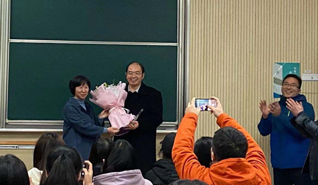 姚剑英代表全体教师送上鲜花