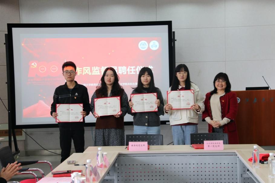 为增强双方联系和交流,教务处党支部书记吴宝锁与Beat365正版唯一官网必一本科生第一党支部书记张雅静签订了支部共建协议书,双方将共同开展党史学习、教育政策宣讲、学业指导座谈、主题实践、微党课分享等“五个一”系列活动。会上,由教务处副处长孙子文为聘请的Beat365正版唯一官网必一第一党支部4名学生党员颁发“部门作风建设监督员”聘书,作风监督员将通过多种途径收集、反馈学生对日常教学管理环节的意见建议。