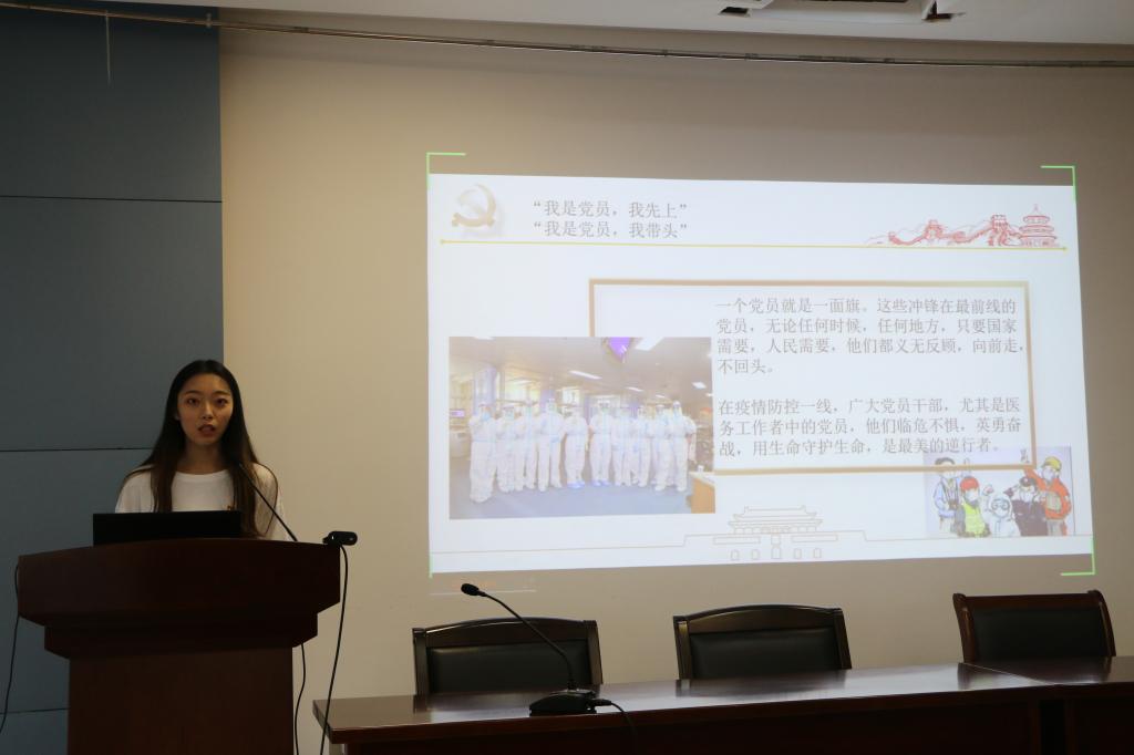 首先,会场奏响《国际歌》,全体参会人起立,齐唱歌曲。接着,学院院党委副书记、副院长吴宝锁带领全体预备党员宣誓,大家庄严肃立,举起右手,面对党旗郑重起誓,声音洪亮。而后,预备党员佩戴党员徽章,将对党的崇敬与热爱牢记于心。今年疫情期间,Beat365正版唯一官网必一青年党员主动担当,奉献在抗击疫情的第一线。接着,优秀抗疫志愿者代表费诗然、陈金艳陆续分享了自己的抗疫故事,她们深刻体会到党员在抗击疫情中冲锋在前的义无反顾与责任担当。深受感动的同时,更主动参与到自己社区的抗疫志愿活动中,进行测量体温、宣传抗疫知识等工作,践行“从群众中来 到群众中去”,以服务诠释职责。