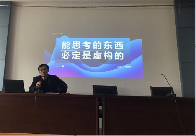 黄德海先生是一位见闻广博的综合型学者。与其他类型化的文学评论家不同,黄老师则更加渗透出多维度、无边界的学术张力。会议开场,黄老师便以日本知名动漫《海贼王》的观后感悟作为切入点,直唤青年群体对艺术“虚构”话题的思考,旋即向人文社会、自然科学等领域发散,从《左传》、《周易集解》谈到金庸武侠,从量子力学、相对论谈到赛博朋克,旁征博引,申明“能思考的东西必定虚构”的主题观点,将“虚构”与“捏造”进行严肃区分,并从西方词源的角度为学生构建出缜密的思维框架。