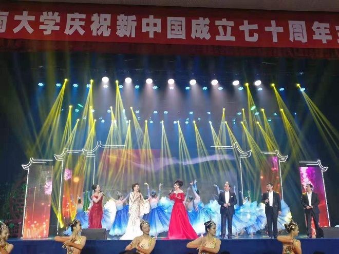 晚会开始之前,校党委书记朱庆葆教授上台致辞,表达全校师生对祖国母亲最诚挚的热爱,同时希望全校上下继续求真务实、脚踏实地,推进世界知名、中国一流、江南风格的研究型大学的建设。主题晚会在上篇“致敬70年”中拉开帷幕。整个晚会以70年峥嵘岁月的回顾为时间线索,以组歌、笛子重奏、配乐诗朗诵、群舞、阿卡贝拉、二胡重奏、踢踏舞、民族健身操等风格多元的形式表达对祖国无以言表的赞美之情。整场晚会即清透雅致又厚重浓郁,演员们的表演恰到好处,赢得台下领导和师生的高度认可和阵阵掌声。尾声《祖国万岁》之后,在场的2000余名师生起立齐唱《我和我的祖国》,将晚会推向高潮。歌曲的情绪深深地感动着在场的每一个人,乐曲结束后,很多师生仍久久不肯离去......