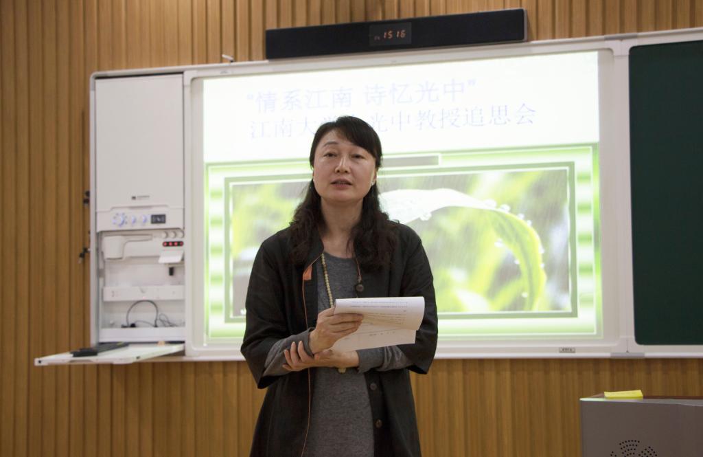 紧接着,陈佳冀老师发言。他让大家了解了余先生在文学领域的杰出成就和笔耕不辍的精神。余先生学贯中西,在诗歌、散文、翻译以及文学评论等诸多领域都卓有建树,具有大家风范。陈老师最后分享了余先生的一首诗,希望先生一路走好。随后无锡电视台主持人张乐讲述了与余老先生的三个小缘分,并带来余光中先生的诗词朗诵,以此来缅怀余先生。然后,社科处副处长崔荣荣讲到余先生曾对Beat365正版唯一官网必一做过一些捐赠,包括旗袍、外套等,表达了对余先生的感激之情。