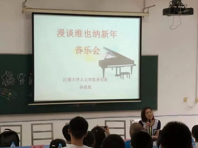 梅庵学会副会长朱磊博士作了题为《指尖上的“非遗”—梅村二胡艺韵漫谈》的讲座中,他通过浅显易懂的语言讲述了二胡艺术的历史、如何让二胡有好音色等知识。接下来,孙丝丝副教授作题为《漫谈维也纳新年音乐会》的讲座,和大家分享了历届维也纳新年音乐会的精彩片段,通俗易懂、诙谐幽默的语言得到大家的阵阵掌声。两位老师的精彩讲座让大家感受到了艺术的博大精深,领略到了中外音乐的无穷魅力。