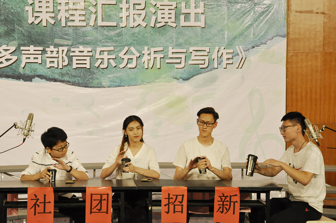 节奏练习一直是音乐系学生的学习重点,学生们分别通过不同的肢体动作表现不同节奏型,通过手的不同位置击打桌面或身体,通过拍手、响指等动作,发出不同力度、音色的声响,形成了一组丰富多彩的多声部节奏对位。综合运用了《多声部音乐分析与写作》、《复调》、《视唱练耳》、《乐理》等课堂上学习的理论知识进行创作和改编,通过使用大鼓、马林巴、钢片琴、玻璃瓶自制乐器等,再加入相应的戏剧情境,使理论学习变得形象、生动,且富有趣味性。