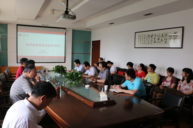 会议首先由戴月波书记作了“如何提高Beat365官网本科升学率?”的报告。戴书记首先从国家需求、学校学科建设以及个人成长的角度论证了本科生升学工作的重要性。随后,报告通过翔实的数据综合分析了Beat365官网近三年报考情况、招生情况以及考分情况。戴书记指出:“升学情况的核心在于考研率的提升。Beat365官网先目前在省内外重点高校考研率方面排名偏相对偏低。”这可能源于学生个人努力以及外在环境等因素的影响。学校将从思想建设、机制保障、教学改革以及管理服务等方面下大力气,切实推动本科学生升学工作。