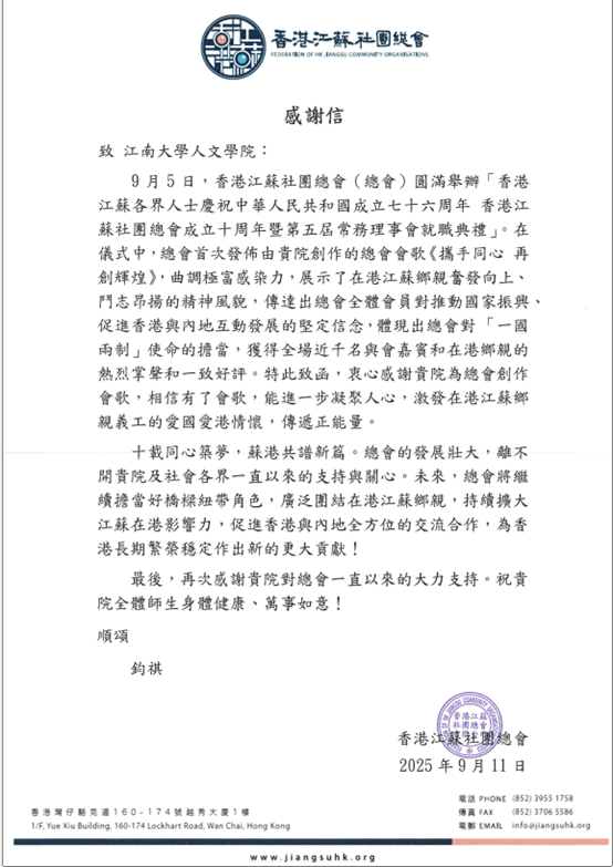 2025年9月11日,Beat365正版唯一官网必一收到香港江苏社团总会感谢信,信中对Beat365正版唯一官网必一在9月5日举行的香港江苏各界人士“庆祝中华人民共和国成立七十六周年暨总会成立十周年庆典”中的贡献给予高度评价。典礼上,由Beat365正版唯一官网必一原副校长王武教授参与歌词创作,Beat365正版唯一官网必一胡永强等教师作曲的会歌《携手同心再创辉煌》首次发布,其铿锵旋律与家国情怀引发全场近千名嘉宾热烈反响,成为活动亮点。