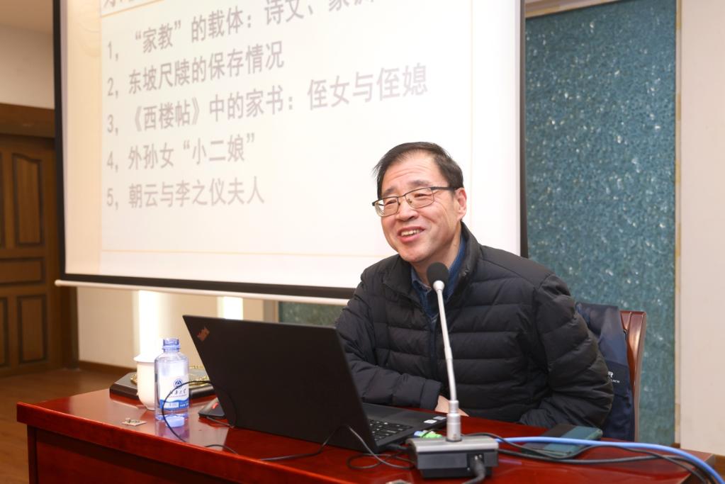 朱刚教授首先谈及自己研究苏氏家风的契机,并提出研究需深入基础资料的重要性,简述了本次讲座的五部分内容,分别是:“家教”的载体:诗文、家训、家书;东坡尺牍的保存情况;《西楼帖》中的家书:侄女与侄媳;外孙女“小二娘”;朝云与李之仪夫人。朱刚教授指出“家教”的载体主要包括诗文、家训和家书。苏洵《名二子说》和苏轼《贺子由生第四孙》展现了苏氏家族在为人、写作、读书上的家教,但含“家教”内容的诗文不足,“家教”更多的载体是“家训”和“家书”。相较于面向公众的诗文,书信更多面向家人,得以反映作者的真实想法,历代家书保存情况不理想,但苏轼是一个例外。