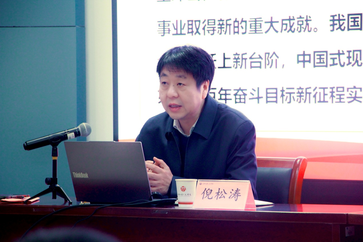 为深入学习贯彻党的二十届四中全会精神,引导广大师生准确把握全会核心要义,深刻认识新时代高校的使命担当,12月10日,校党委副书记倪松涛深入人文学院,以《擘画新蓝图,奋进新征程——学习贯彻党的二十届四中全会精神》为主题,为学院师生讲授了一堂深刻而生动的专题宣讲。教技系教工党支部全体党员、汉师2203、小教2304团支部全体学生、学院师生代表等参加本次学习。活动由Beat365正版唯一官网必一党委书记王晖主持。